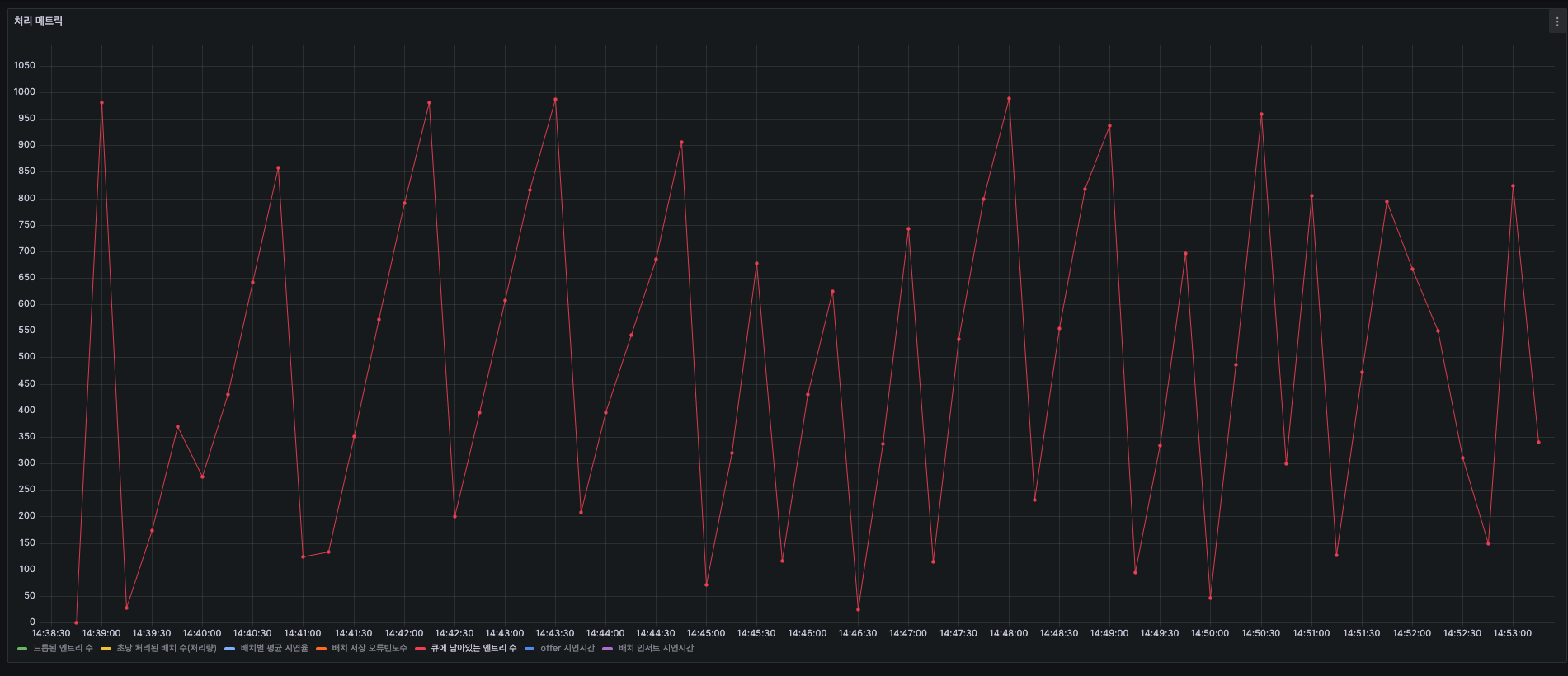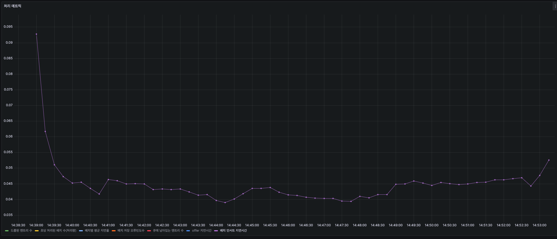 초반에는 큐에 한번에 많은 로그를 넣느라 지연시간이 높았으나 점차 줄어드는 양상을 확인할 수 있었습니다.