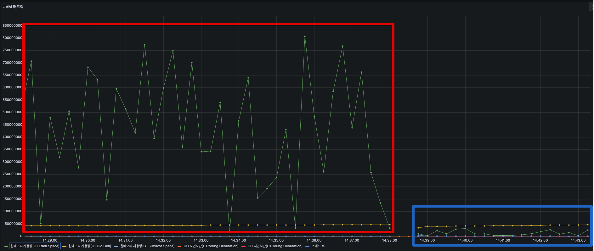 - JDBC Batch Insert : G1 Eden Space 힙 메모리 사용률이 최대 30MB 도달, G1 Old Gen은 비슷하게 40~50MB 유지